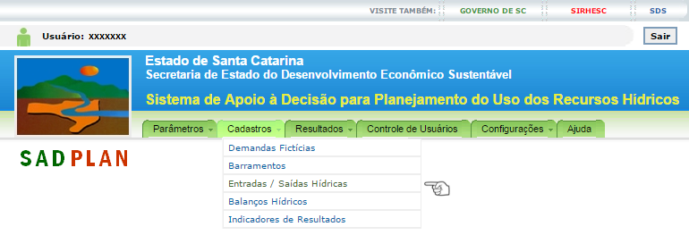 Os cadastros de Entrada / Saída Hídrica podem ser acessados através do menu do sistema conforme mostra a imagem que segue.