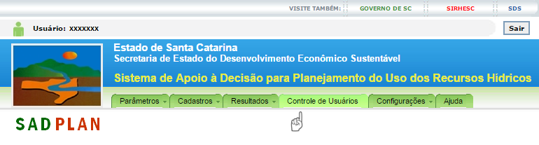 O controle de Usuários do SADPLAN pode ser acessado através do menu do sistema conforme mostra a imagem que segue.
