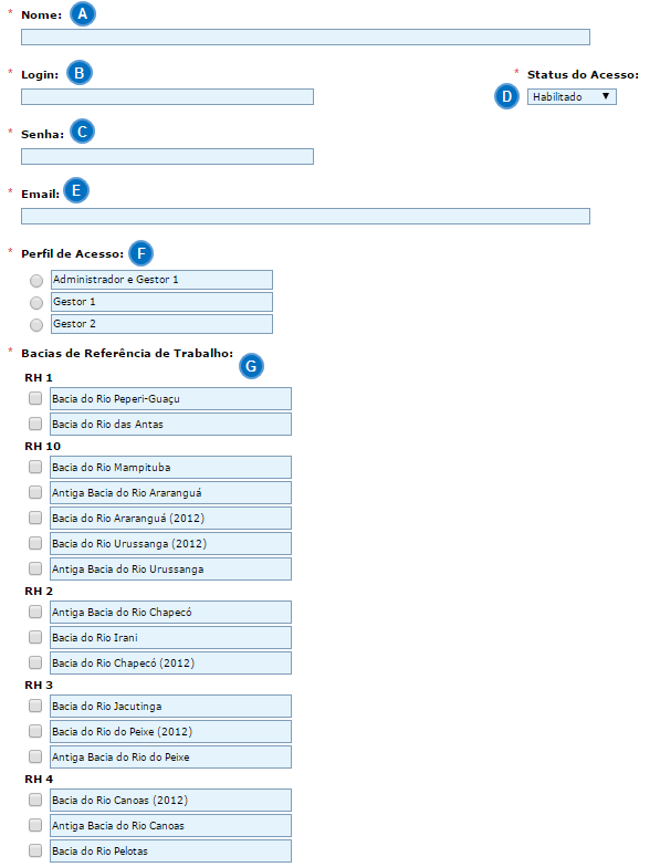 Bacias de Referência de Trabalho: conjunto de bacias hidrográficas com as quais o usuário do SADPLAN tem permissão para trabalhar. Esta permissão inclui tanto o acesso para criar balanços hídricos nas bacias de referência quanto para visualizar resultados de balanços hídricos criados para tais bacias por outros usuários do SADPLAN.