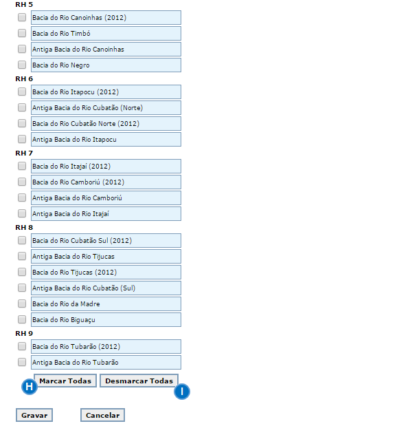 Importante: para agilizar a seleção de todas as bacias de referência, clique no botão Marcar Todas (em ). E, ao contrário, para agilizar a retirada da seleção de todas as bacias de referência, clique no botão Desmarcar Todas (em ).