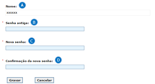 Ao terminar o preenchimento dos dados, clique no botão Gravar se desejar gravar a alteração da senha. Caso não deseje gravar a alteração da senha, clique no botão Cancelar a qualquer tempo.