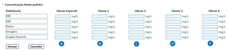 O formulário de configuração da concentração limite de substâncias físico-químicas é composto pelos seguintes campos: