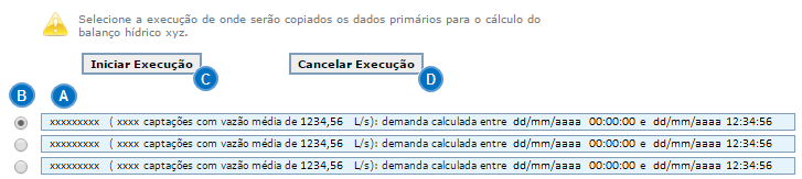 Todas as execuções prévias para a bacia de referência indicada no cadastro do Balanço Hídrico são apresentadas em , onde aparecem informações importantes para auxiliar na identificação daquela que será escolhida. A execução da qual serão copiados os dados de demanda hídrica é selecionada em .