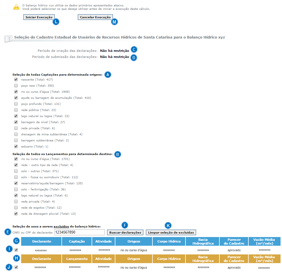 Antes de iniciar a transferência de dados do CEURH para o SADPLAN é possível ainda indicar os pontos de captação e/ou lançamento que não devem fazer parte deste conjunto de dados transferidos. Para tal, é preciso informar o CNPJ ou CPF do declarante no campo e clicar no botão Buscar declarações . Com isto, o SADPLAN irá apresentar os pontos de captação e/ou de lançamento que existem na declaração de uso de recursos hídricos do empreendedor. Os pontos de captação aparecem nas colunas em azul () e os pontos de lançamento aparecem nas colunas em marrom ().